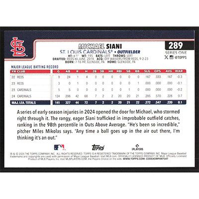 This is a 2025 Topps Michael Siani baseball card. The card is #289 and pictures show condition.