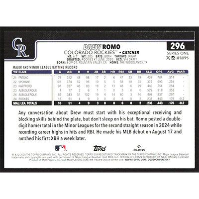 This is a 2025 Topps Drew Romo baseball card. The card is #296 and pictures show condition.