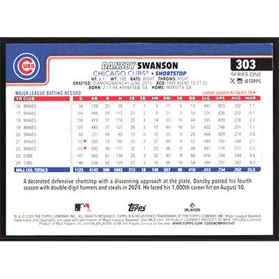 This is a 2025 Topps Dansby Swanson baseball card. The card is #303 and pictures show condition.