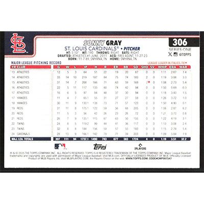 This is a 2025 Topps Sonny Gray baseball card. The card is #306 and pictures show condition.