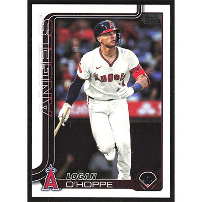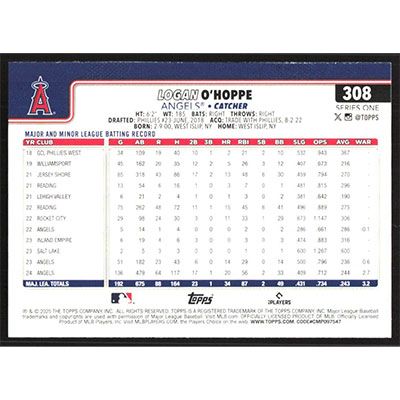 This is a 2025 Topps Logan O'Hoppe baseball card. The card is #308 and pictures show condition.