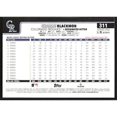 This is a 2025 Topps Charlie Blackmon baseball card. The card is #311 and pictures show condition.