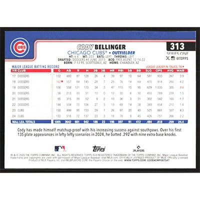 This is a 2025 Topps Cody Bellinger baseball card. The card is #313 and pictures show condition.