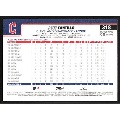 This is a 2025 Topps Joey Cantillo baseball card. The card is #318 and pictures show condition.