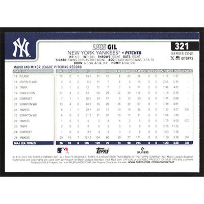 This is a 2025 Topps Luis Gil baseball card. The card is #321 and pictures show condition.