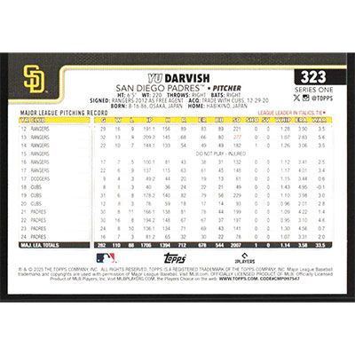 This is a 2025 Topps Yu Darvish baseball card. The card is #323 and pictures show condition.
