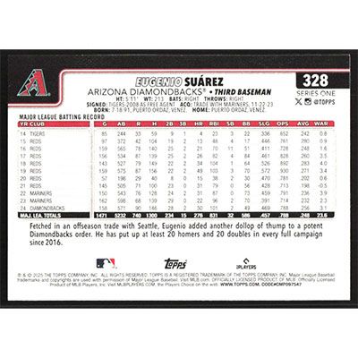 This is a 2025 Topps Eugenio Suarez baseball card. The card is #328 and pictures show condition.