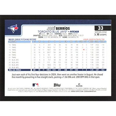 This is a 2025 Topps Jose Berrios baseball card. The card is #33 and pictures show condition.