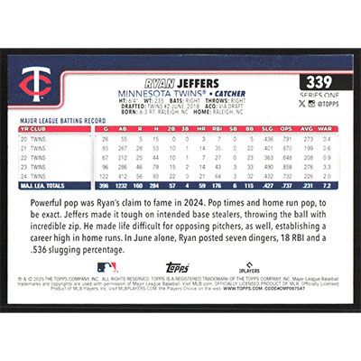 This is a 2025 Topps Ryan Jeffers baseball card. The card is #339 and pictures show condition.