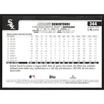 This is a 2025 Topps Andrew Benintendi baseball card. The card is #344 and pictures show condition.