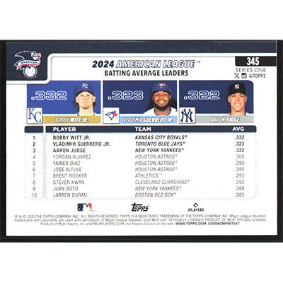 This is a 2025 Topps Bobby Witt Jr., Vladimir Guerrero Jr. and Aaron Judge League Leaders baseball card. The card is #345 and pictures show condition. Team(s): Kansas City Royals/Toronto Blue Jays/New York Yankees