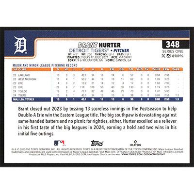 This is a 2025 Topps Brant Hurter baseball card. The card is #348 and pictures show condition.