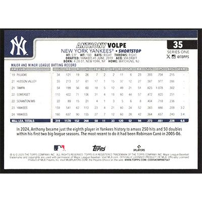 This is a 2025 Topps Anthony Volpe baseball card. The card is #35 and pictures show condition.