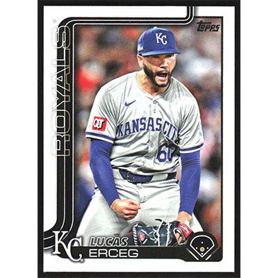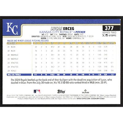 This is a 2025 Topps Lucas Erceg baseball card. The card is #377 and pictures show condition.