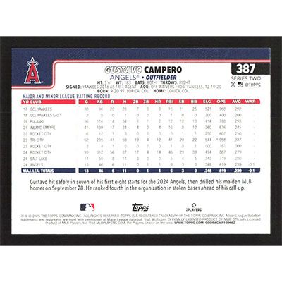 This is a 2025 Topps Gustavo Campero baseball card. The card is #387 and pictures show condition.