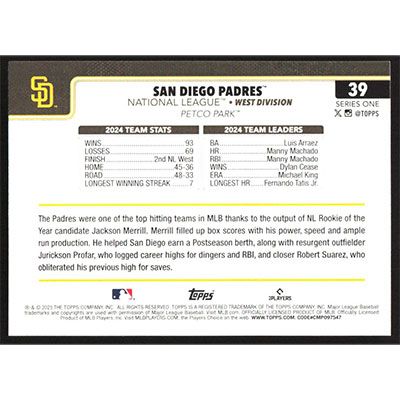 This is a 2025 Topps San Diego Padres Team Card baseball card. The card is #39 and pictures show condition.