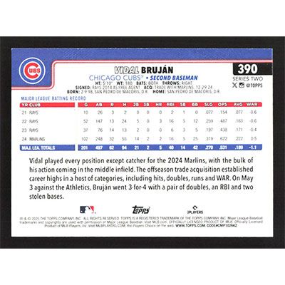 This is a 2025 Topps Vidal Brujan baseball card. The card is #390 and pictures show condition.