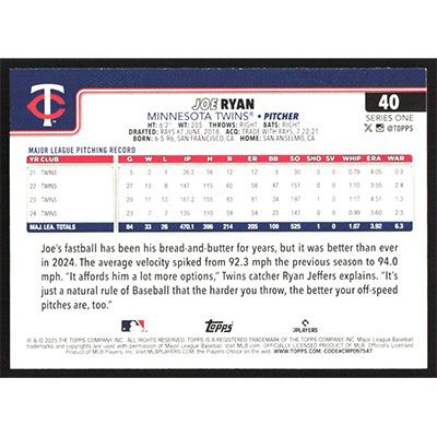 This is a 2025 Topps Joe Ryan baseball card. The card is #40 and pictures show condition.