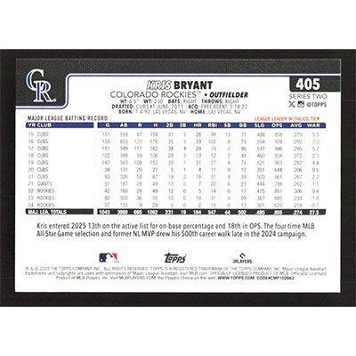 This is a 2025 Topps Kris Bryant baseball card. The card is #405 and pictures show condition.