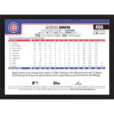 This is a 2025 Topps Miguel Amaya baseball card. The card is #406 and pictures show condition.