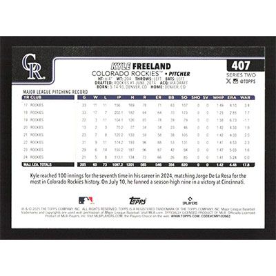 This is a 2025 Topps Kyle Freeland baseball card. The card is #407 and pictures show condition.