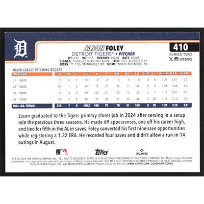 This is a 2025 Topps Jason Foley baseball card. The card is #410 and pictures show condition.