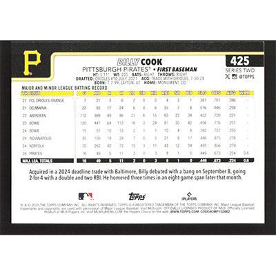 This is a 2025 Topps Billy Cook baseball card. The card is #425 and pictures show condition.