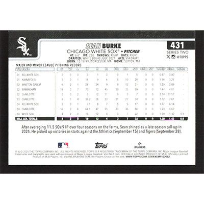 This is a 2025 Topps Sean Burke baseball card. The card is #431 and pictures show condition.