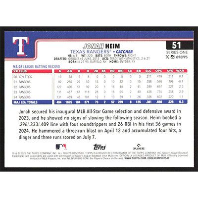 This is a 2025 Topps Jonah Heim baseball card. The card is #51 and pictures show condition.