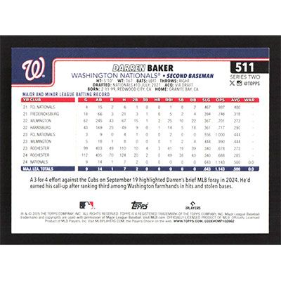 This is a 2025 Topps Darren Baker baseball card. The card is #511 and pictures show condition.