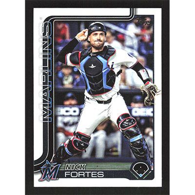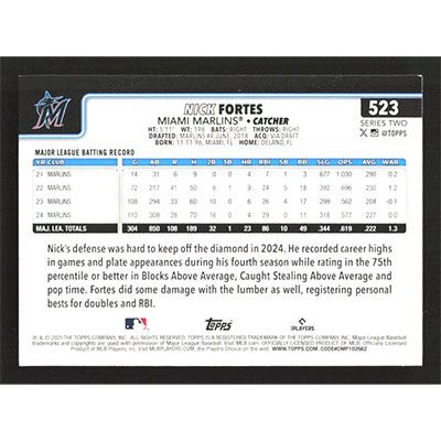 This is a 2025 Topps Nick Fortes baseball card. The card is #523 and pictures show condition.