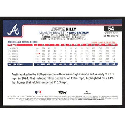 This is a 2025 Topps Austin Riley baseball card. The card is #54 and pictures show condition.