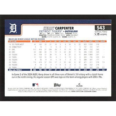 This is a 2025 Topps Kerry Carpenter baseball card. The card is #543 and pictures show condition.