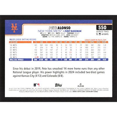 This is a 2025 Topps Pete Alonso baseball card. The card is #550 and pictures show condition.