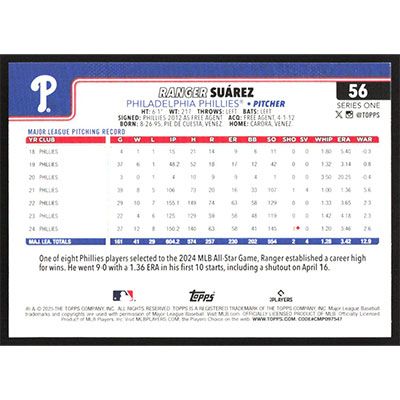 This is a 2025 Topps Ranger Suarez baseball card. The card is #56 and pictures show condition.