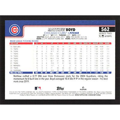 This is a 2025 Topps Matthew Boyd baseball card. The card is #562 and pictures show condition.