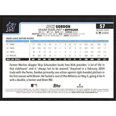 This is a 2025 Topps Nick Gordon baseball card. The card is #57 and pictures show condition.