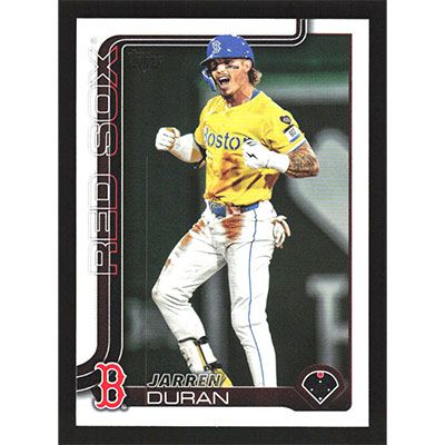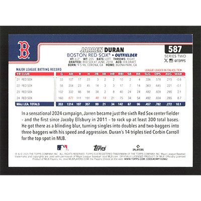 This is a 2025 Topps Jarren Duran baseball card. The card is #587 and pictures show condition.