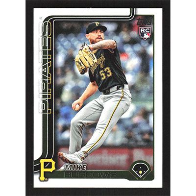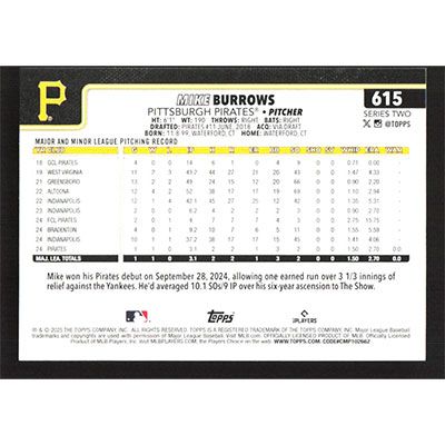 This is a 2025 Topps Mike Burrows baseball card. The card is #615 and pictures show condition.