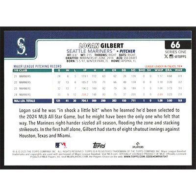 This is a 2025 Topps Logan Gilbert baseball card. The card is #66 and pictures show condition.