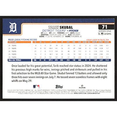 This is a 2025 Topps Tarik Skubal baseball card. The card is #71 and pictures show condition.