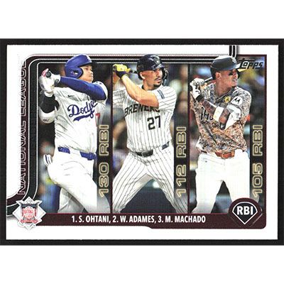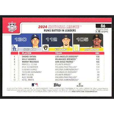 This is a 2025 Topps Shohei Ohtani, Willy Adames and Manny Machado League Leaders baseball card. The card is #86 and pictures show condition. Team(s): Los Angeles Dodgers/Milwaukee Brewers/San Diego Padres