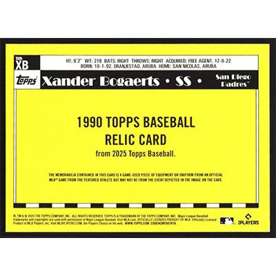 This is a 2025 Topps '90 Relics Xander Bogaerts Jersey baseball card. The card is #T90R-XB and pictures show condition.