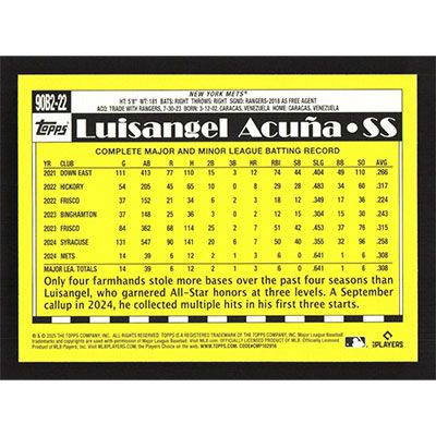 This is a 2025 Topps '90 Series 2 Luisangel Acuña baseball card. The card is #90B2-22 and pictures show condition. Team(s): New York Mets Rookie Card (RC)
