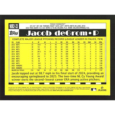This is a 2025 Topps '90 Series 2 Jacob deGrom baseball card. The card is #90B2-33 and pictures show condition.