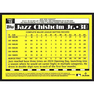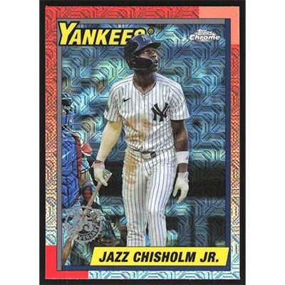 This is a 2025 Topps '90 Silver Pack Chrome Jazz Chisholm Jr. baseball card. The card is #T90C-18 and pictures show condition.