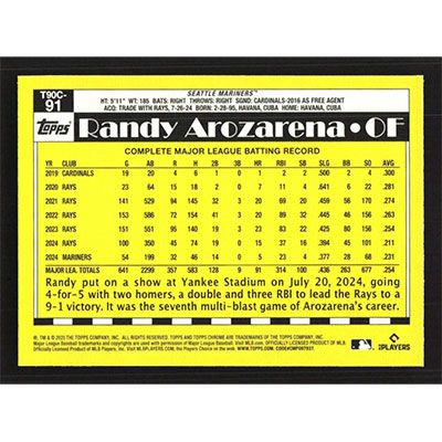 This is a 2025 Topps '90 Silver Pack Chrome Randy Arozarena baseball card. The card is #T90C-91 and pictures show condition.