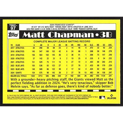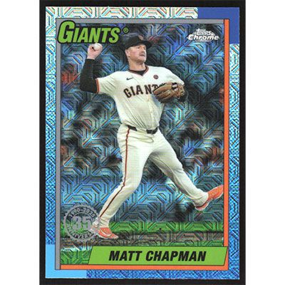 This is a 2025 Topps '90 Silver Pack Chrome Matt Chapman baseball card. The card is #T90C-97 and pictures show condition.