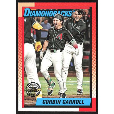 This is a 2025 Topps '90 Corbin Carroll baseball card. The card is #T90-45 and pictures show condition.