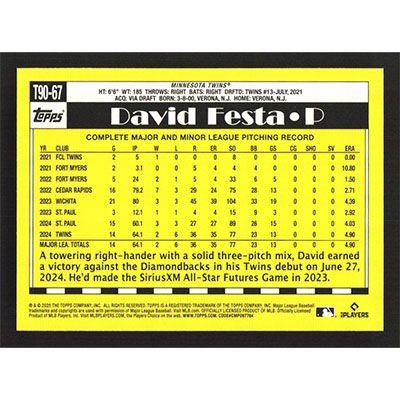 This is a 2025 Topps '90 David Festa baseball card. The card is #T90-67 and pictures show condition.